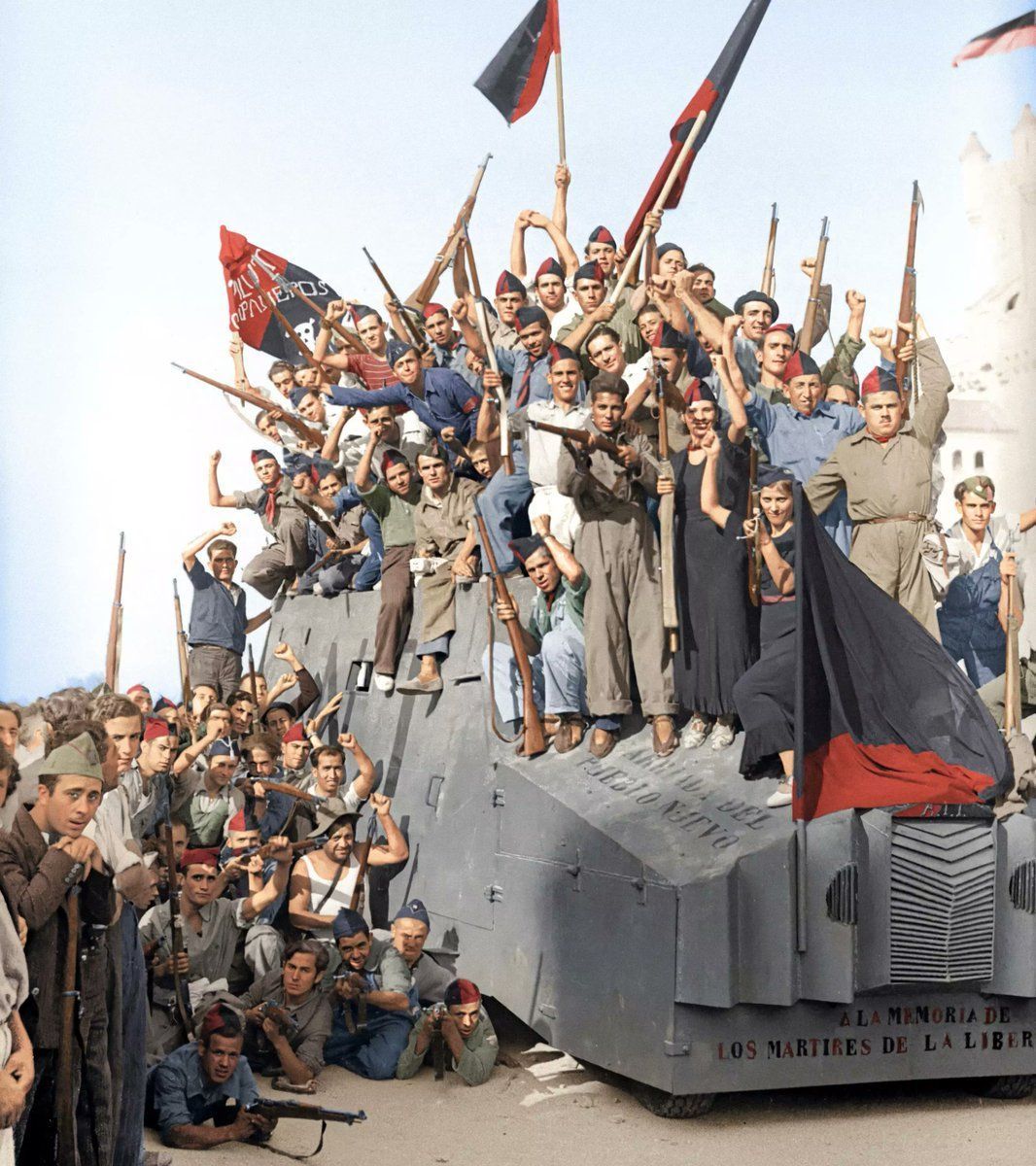 Barcelona, 1936. Un grup d'anarquistes de la CNT, sobre un vehicle blindat, a la Caserna del Bruc (rebatejada com a Caserna Bakunin durant la guerra). John Langdon-Davies Julius Backman