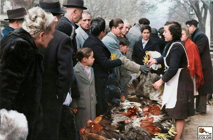 1947. Barcelonins comprant pollastres i galls dindi a la fira d'aviram de la Rambla per les festes de Nadal. Pérez de Rozas